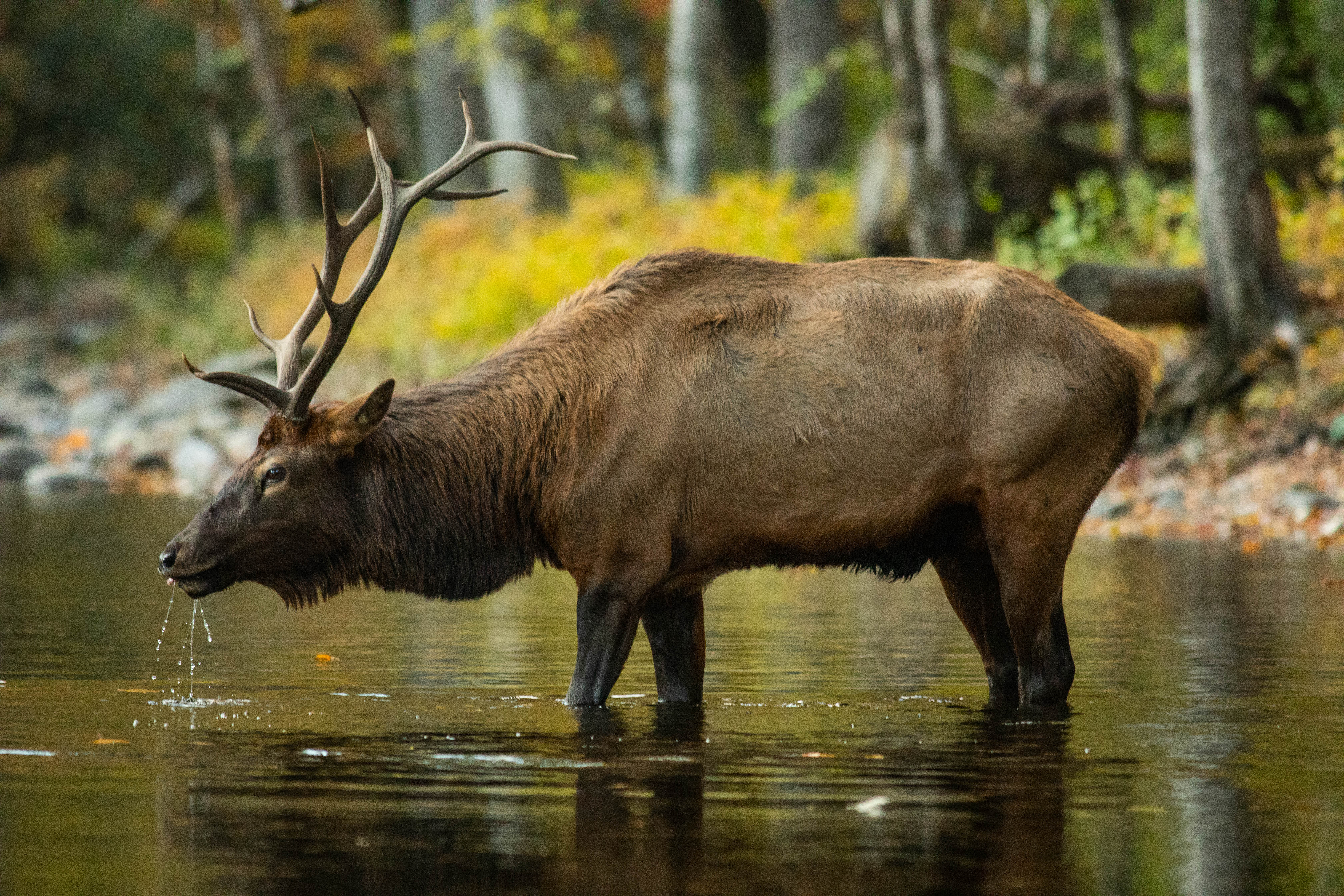 I was correct about the timing. It was about an hour before the sun went behind the trees on the western hillside. When I arrived there were no cars parked along the side of the road and no elk in the viewing field. The parking lot at the park visitors center was filling up rapidly. I parked and hit the paved trail with my camera and a 400 mm lens. I walked along the river on the paved trail along the Oconaluftee river. I noticed a group of camera junkies set up and staring across the river. There was a lone bull elk across the river. He was on his belly in some tall grass, eating and waiting. I struck up conversation and one bystander who said that there had been a couple bulls fighting in the field the other night and this might be the loser, nursing his injuries and respecting the new boundaries that were established. We stood talking for almost an hour hoping that he would cross the river. Patience, as in all things, is often rewarded. The majestic animal finally stood up, stretched, and gradually approached the river bank. He was, indeed, injured. He favored his left, front leg. He approached the river and gingerly crossed, pausing to drink his fill of mountain stream water