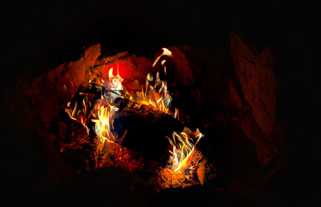 I stare back at the fire and the hypnotic flames and changing patterns of light keep my attention. Looking at the trees, then back at the fire where remnants of some other tree are busily transforming themselves into gasses and ash it reminds me that everything is temporary. The firewood in my fire ring was a large poplar tree not long ago. My guess is that it became a threat to someone’s property, or perhaps when it succumbed to the inevitable it fell across a road or a trail and required removal, and here are the remnants being rendered by fire into carbon and other things so necessary for life.